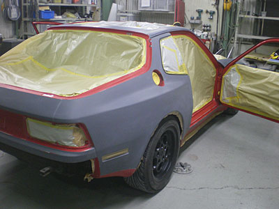 ◆ポルシェ944(全塗装)塗装前の研ぎが終了し、マスキングをしました。明日塗装の予定です。