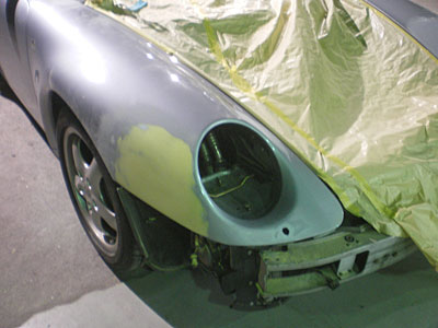 ◆セリカ(WRC仕様) クォーターのパテの部分に仮のサフェーサーを塗りました