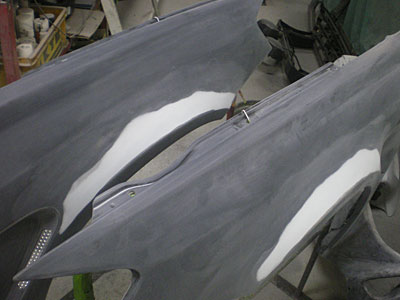 ◆セリカ(WRC仕様) クォーターのパテの部分に仮のサフェーサーを塗りました