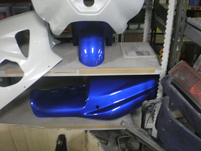 ◆GSXR750(カウル補修)次は塗り分けラインを決めますので、オーナー様の御来店をお待ちしています。