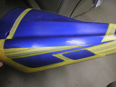 ◆XJR(バイク塗装)塗り分けのラインを引いています。やっとシートカウルのラインが引けました。