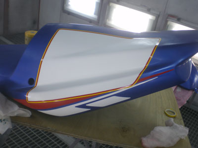 ◆GSXR750(カウル補修)次は塗り分けラインを決めますので、オーナー様の御来店をお待ちしています。