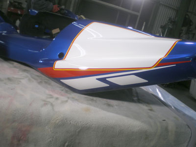 ◆GSXR750(カウル補修)次は塗り分けラインを決めますので、オーナー様の御来店をお待ちしています。