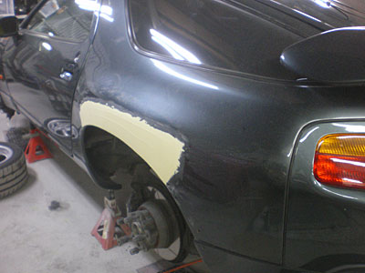 ◆セリカ(WRC仕様) 左フェンダーの成形中です。仮のサフェーサーを入れました。