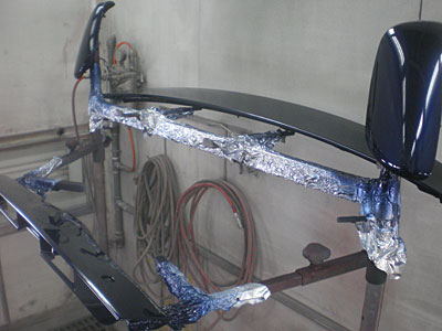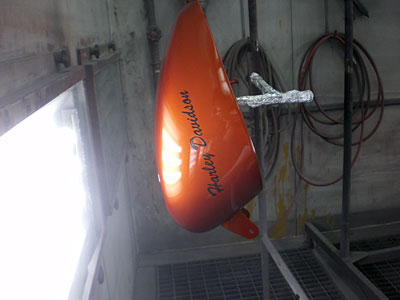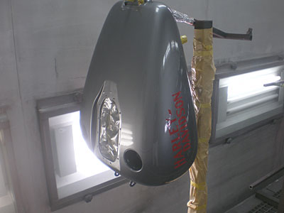 ◆ハーレーXL883R(バイク塗装)タンクに1回目のオーバークリヤをしました。タイヤを外し、下地作業をしています