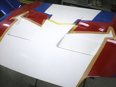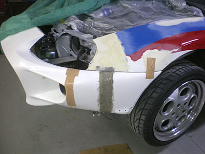 ◆スープラ(事故修理)ボンネットは4色目のラインを引きました。フロントバンパーが到着しましたので、加工に取り掛かりました。
