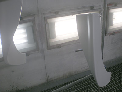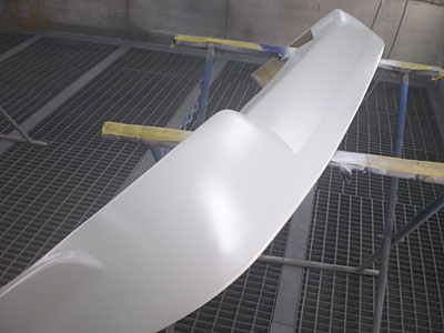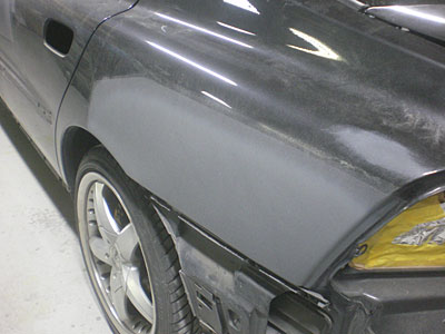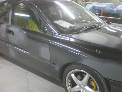 ◆ボルボ(全塗装)下地作業中です。エアロのフィッティングをし、サフェーサーを入れました。