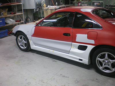 ◆MR2(全塗装)本体の下地作業が概ね終了、エアロの合せをしています。単体部品の