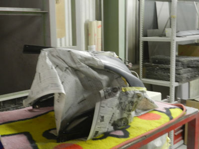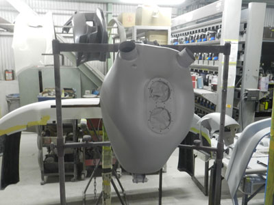 ◆RVF(カウル塗装)アッパーカウル穴を埋めています、タンクにサフが入りました