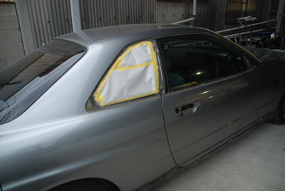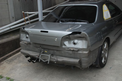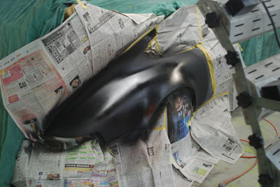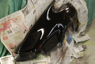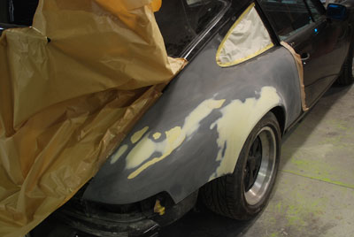 ◆ポルシェ930(錆び修理)パテで修正してサフェーサーを塗り、面の確認のために一度黒を塗りました