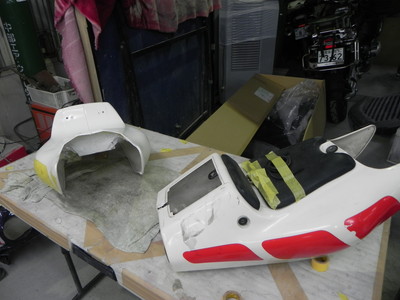 ◆GSX-R1100(シートカウル塗装)塗り分けのラインを引きました。