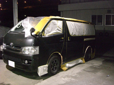 ◆ハイエース(いたずら傷補修)マスキングしました、明日塗装の予定です。