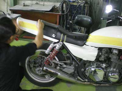 ◆ゼファー(バイク塗装)ライン引き作業に入りました