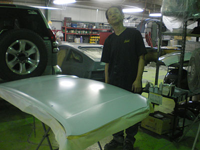 ◆プラド(飛石修理)ボンネットの塗装を剥離しサフェーサーを入れました